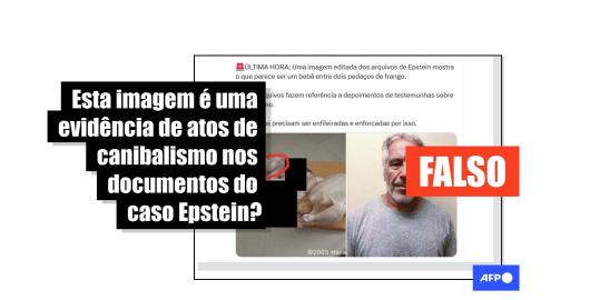 Imagem Arquivos Epstein Publicado em 26/02/2026 Fotomontagem com pedaços de frango circula falsamente como prova de canibalismo nos arquivos Epstein