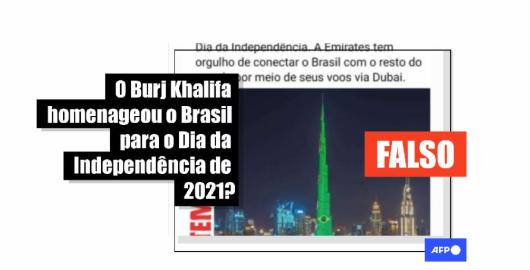 Imagem Publicado em 10/09/2021 Imagem do Burj Khalifa iluminado com a bandeira brasileira é de homenagem em 2020, não em 2021