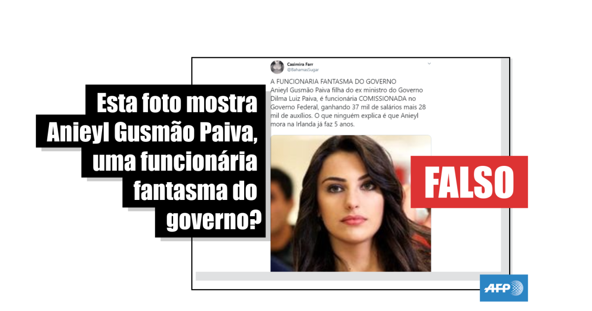 “A FUNCIONARIA FANTASMA DO GOVERNO Anieyl Gusmão Paiva filha do ex ministro do Governo Dilma Luiz Paiva, é funcionária COMISSIONADA no Governo Federal, ganhando 37 mil de salários mais 28 mil de auxílios. O que ninguém explica é que Anieyl mora na Irlanda já faz 5 anos [sic]”, diz uma postagem feita no Twitter, que obteve mais de 1.500 retuítes e 2.700 curtidas. Esta alegação circulou com a mesma imagem e textos semelhantes também no Facebook (1, 2).