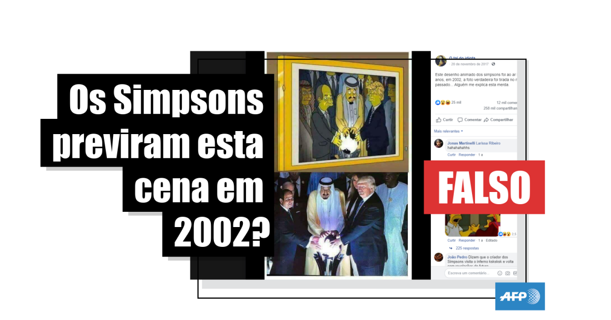 “Este desenho animado dos simpsons foi ao ar há 15 anos, em 2002, a foto verdadeira foi tirada no mês passado...”, dizem as legendas das publicações em português, compartilhadas mais de 258 mil vezes (1) desde junho de 2017 tanto no Facebook quanto no Twitter, e que mostra um cena da série juntamente com a foto original.
