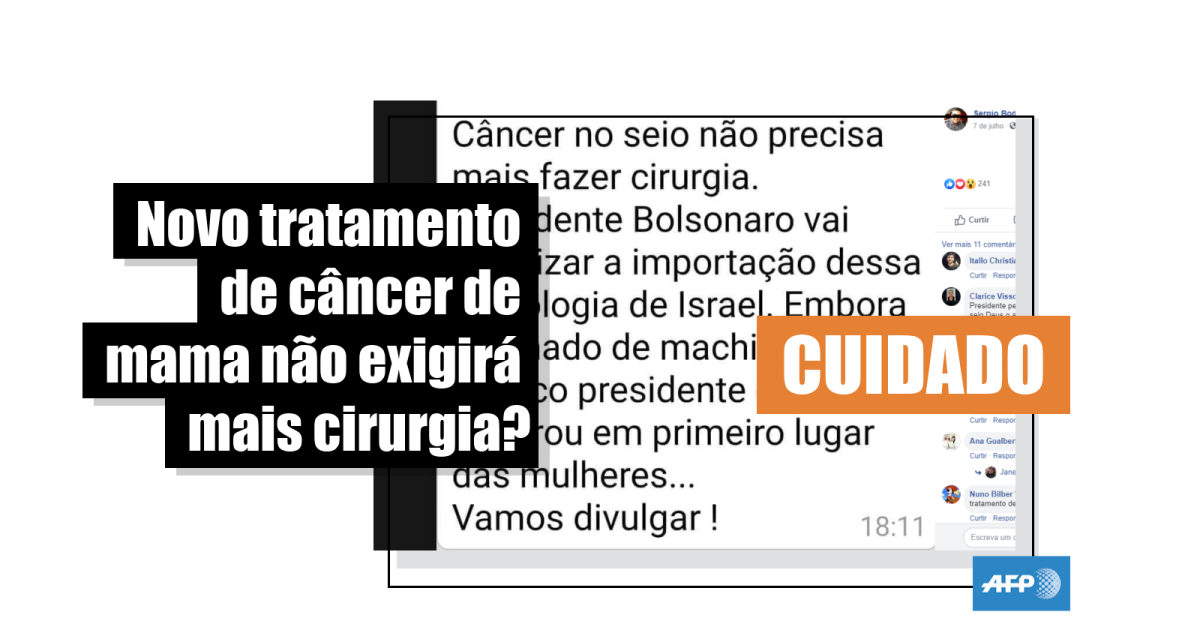 “Câncer no seio não precisa mais fazer cirurgia. Presidente Bolsonaro vai autorizar a importação dessa tecnologia de Israel. Embora chamado de machista, foi o único presidente que se lembrou em primeiro lugar das mulheres… Vamos divulgar! [sic]”, diz a legenda da publicação, que data de 7 de julho de 2019.