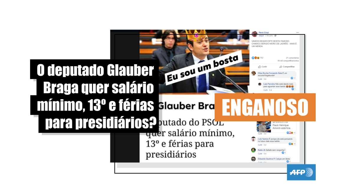 “VAMOS DEIXAR ESTE BOSTA FAMOSO, CHAMOU SERGIO MORO DE LADRÃO.. MAIS É UM MERDA [sic]”, diz a legenda da publicação, que, junto com a foto do político, também tem escrito: “Deputado do PSOL quer salário mínimo, 13º e férias para presidiários”. No Twitter, a postagem circulou tanto em 2018 como em 2019.
