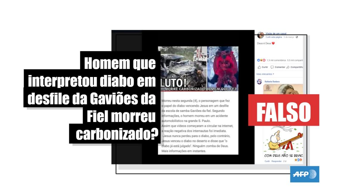 Contudo, a alegação é falsa e o ator que interpretou o diabo na avenida está bem, mas suspendeu suas contas nas redes sociais para se preservar, de acordo com a confirmação à AFP do coreógrafo da comissão de frente da Gaviões da Fiel, Edgar Junior: “O rapaz que fez a comissão de frente prefere ficar, por enquanto, anônimo. É melhor para ele, para a família dele, para o trabalho dele”, indicou.