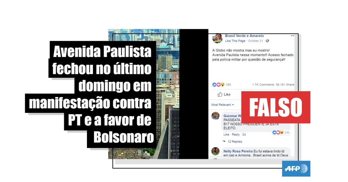 Não, a Avenida Paulista não fechou no último domingo em uma manifestação contra o PT e a favor de Bolsonaro