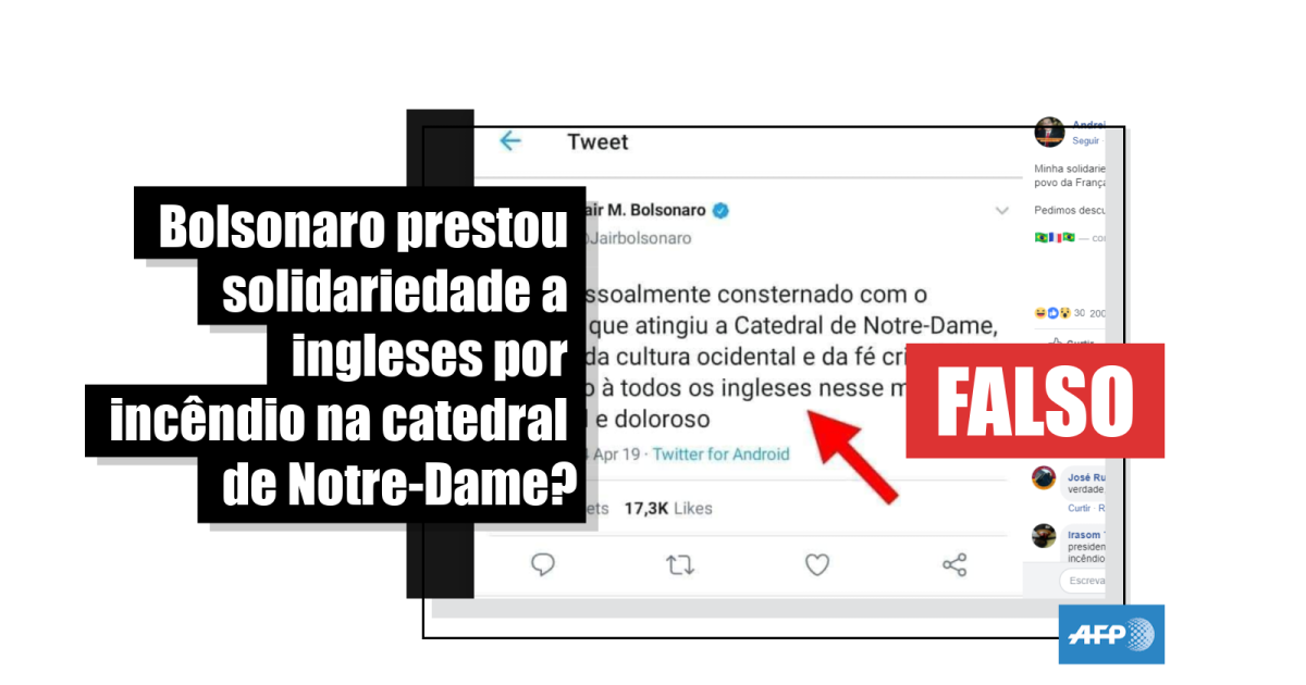 Postagens compartilhadas (1, 2 e 3) mais de 1.500 vezes desde que foram publicadas, em 16 de abril de 2019, alegam que o presidente Jair Bolsonaro, do Partido Social Liberal (PSL), prestou solidariedade pelo incêndio na Catedral de Notre-Dame aos ingleses, e não aos franceses. O suposto tuíte diz: “Estou pessoalmente consternado com o incêndio que atingiu a catedral de Notre-Dame, símbolo da cultura ocidental e da fé cristã. Me solidarizo a todos os ingleses nesse momento tão difícil e doloroso”.