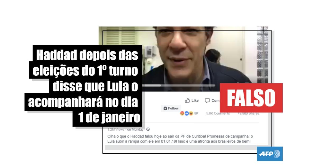 Uma das publicações que começaram a circular um dia depois da jornada eleitoral de 7 de outubro, que teve 1,2 milhão de visualizações e 50 mil compartilhamentos, afirma: “Olha o que o Haddad falou hoje ao sair da PF de Curitiba! Promessa de campanha: o Lula subir a rampa com ele em 01.01.19! Isso é uma afronta aos brasileiros de bem!”. A conta de Facebook do Partido Social Liberal (PSL) no Rio de Janeiro, formação do presidenciável com mais votos no primeiro turno, o político de extrema direita Jair Bolsonaro, foi uma das que viralizou a informação.