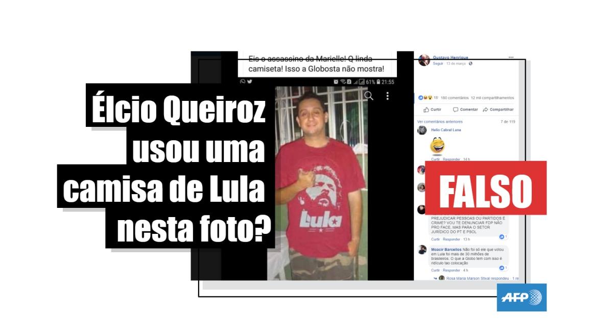 “Eis o assassino da Marielle! Que linda camiseta! Isso a Globosta não mostra!”, diz a publicação de 13 de março de 2019 com uma foto de Élcio Vieira de Queiroz, preso na véspera, usando uma suposta camisa com a imagem do ex-presidente pelo Partido dos Trabalhadores (PT) Luiz Inácio Lula da Silva.