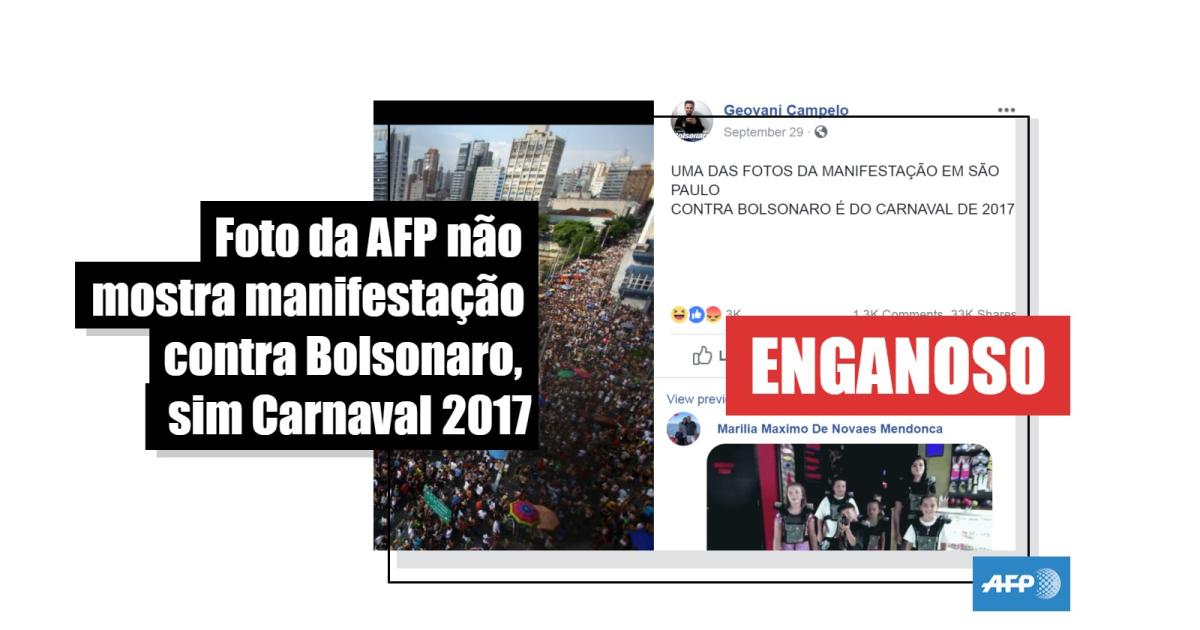 Não, esta foto da AFP não é do carnaval de 2017 e sim, mostra a manifestação contra Bolsonaro em São Paulo