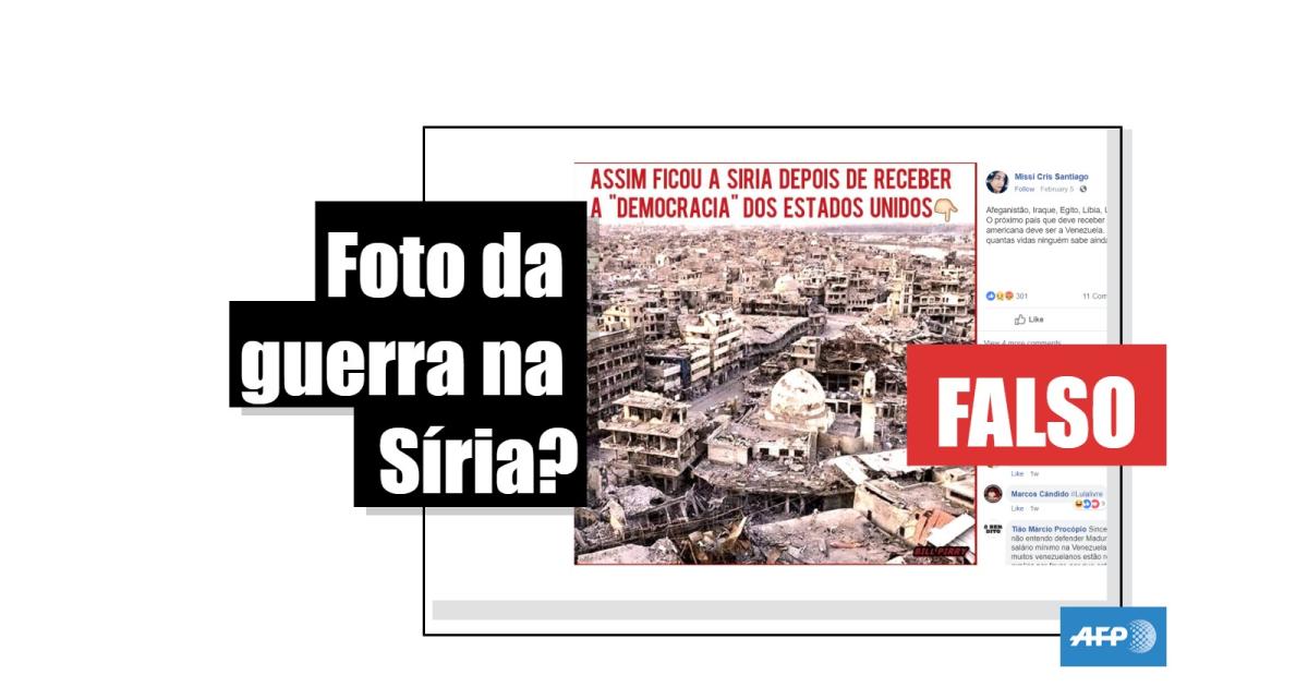 “Assim ficou a Síria depois de receber a ‘democracia’ dos Estados Unidos”, diz a descrição da imagem que mostra uma cidade destruída por bombardeios, compartilhada mais de 4.500 vezes no Facebook desde que foi publicada no dia 5 de fevereiro de 2019.