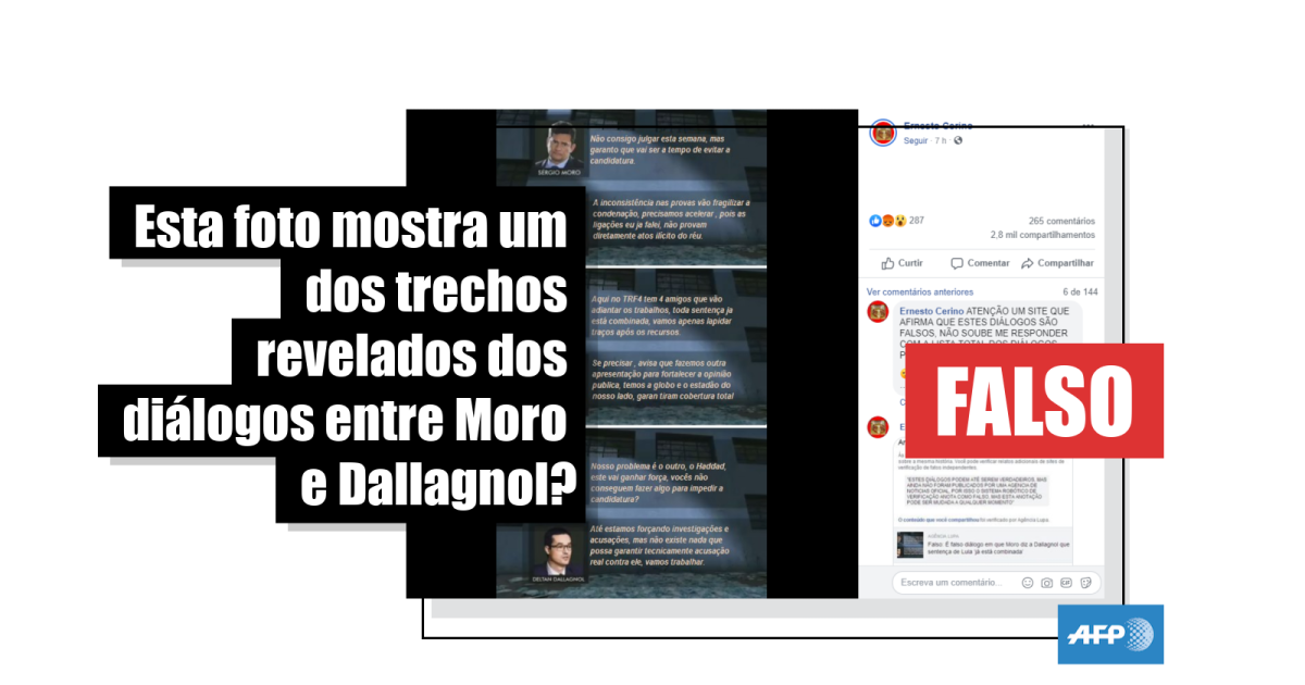 A equipe de checagem da AFP entrou em contato com o Intercept para verificar se estes trechos realmente faziam parte das mensagens às quais o site teve acesso. Em resposta, o diretor de Comunicações, Rodrigo Brandão, afirmou: “Isso é fake e não é parte do material no nosso site”.