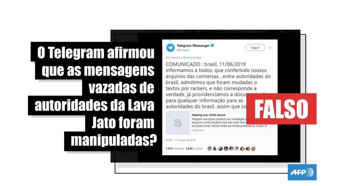 Procurado pela AFP, o Telegram confirmou que o tuíte é uma montagem. “Isso é obviamente uma captura de tela manipulada. Nossa conta principal do Telegram nunca tuíta em português (muito menos em português ruim)”, disse Markus Ra, um porta-voz do aplicativo, em tradução livre.