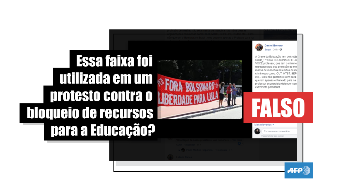 Em resumo, a faixa com os dizeres “Fora Bolsonaro” e “Liberdade para Lula” não foi fotografada durante um dos atos de 15 de maio, como sugere a publicação viralizada, mas em um protesto contra o golpe militar de 1964, realizado em 31 de março em São Paulo por movimentos de esquerda.