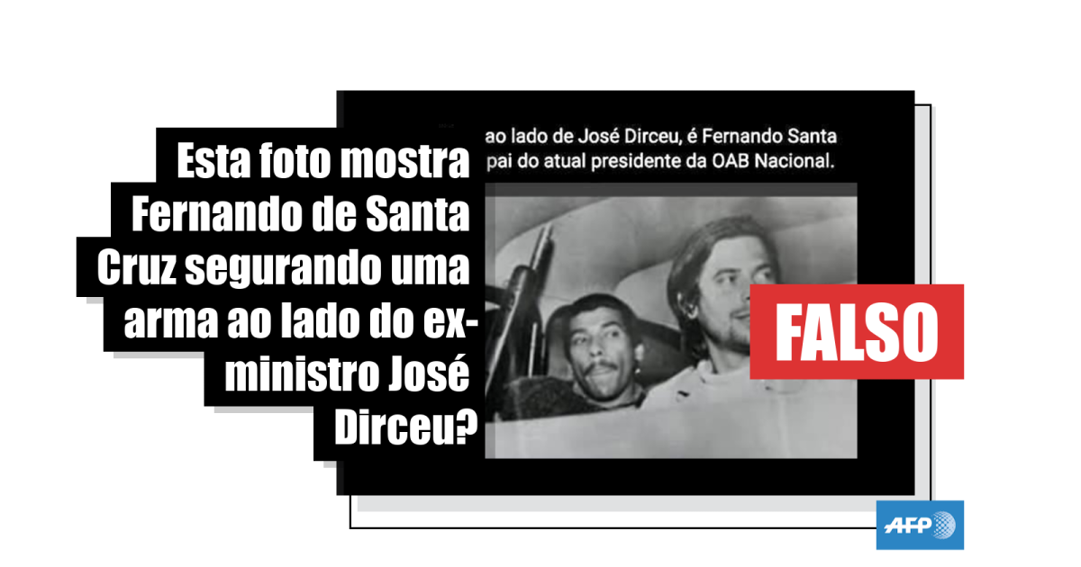 Uma busca reversa* mostra que quem aparece no canto direito da imagem viralizada realmente é José Dirceu, então líder estudantil e futuro homem forte do Partido dos Trabalhadores (PT) e ministro da Casa Civil (2003-2005) do primeiro governo de Luiz Inácio Lula da Silva (2003-2011). No entanto, o homem visto segurando uma arma ao seu lado não é Santa Cruz.