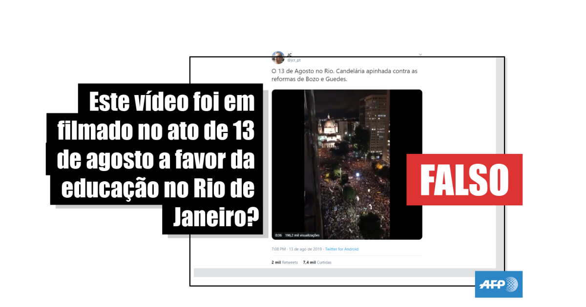 “O 13 de Agosto no Rio. Candelária apinhada contra as reformas de Bozo e Guedes”, diz uma das publicações, replicada mais de 2 mil vezes no Twitter. O mesmo vídeo ilustra artigo intitulado “Vista aérea da Candelária lotada no tsunami da Educação de 13 de agosto”, compartilhado mais de mil vezes no Facebook, segundo a ferramenta CrowdTangle. Ambas as postagens já foram apagadas.