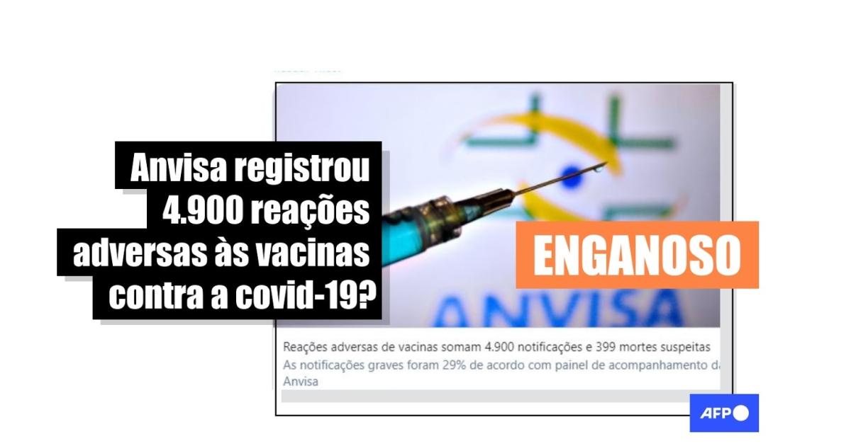 “Reações adversas de vacinas somam 4.900 notificações e 399 mortes suspeitas. As notificações graves foram 29% de acordo com o painel de acompanhamento da Anvisa”, diz a manchete que foi compartilhada centenas de vezes no Twitter (1, 2, 3), Facebook (1, 2, 3) e Instagram (1, 2, 3).