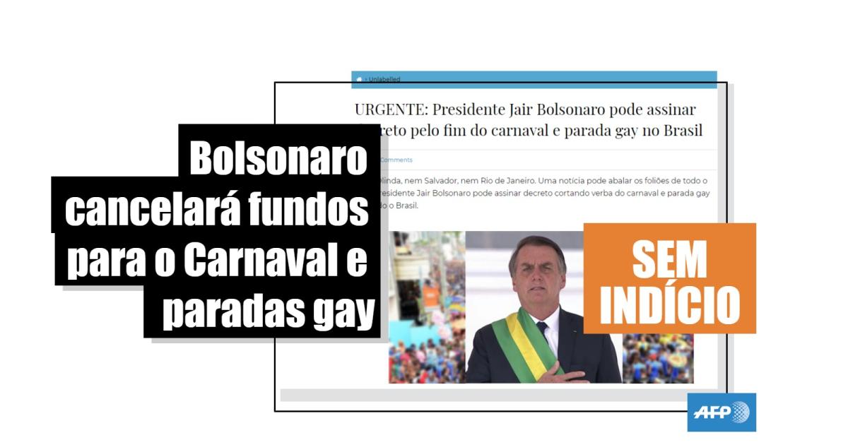 “Nem Olinda, nem Salvador, nem Rio de Janeiro. Uma notícia pode abalar os foliões de todo o país. Presidente Jair Bolsonaro pode assinar decreto cortando verba do carnaval e parada gay em todo o Brasil”, diz uma das publicações que disseminam a informação enganosa, compartilhada mais de 66.000 vezes no portal Folhabrasilnews.com.