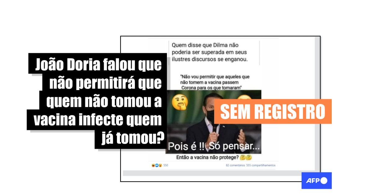 “Quem disse que Dilma [Rousseff] não poderia ser superada em seus ilustres discursos se enganou. ‘Não vou permitir que aqueles que não tomem a vacina passem Corona para os que tomaram’. Pois é !! Só pensar… Então a vacina não protege?”, indica o texto sobreposto a uma imagem de João Doria, compartilhado milhares de vezes no Facebook (1, 2, 3) desde 17 de outubro, em meio à polêmica que envolve a CoronaVac, imunizante produzido pela farmacêutica chinesa Sinovac Biotech em parceria com o Instituto Butantan.