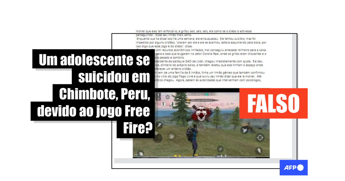 “CHIMBOTE: PERU JOGOS ADOLESCENTES PENDURADOS POR FICAR LOUCO COM O JOGO PERIGOSO PARA CRIANÇAS E JOVENS ESTE JOGO SE CHAMA #FREE FIRE ESTE JOGO LEVO PARA O SUICÍDIO”, começa o texto replicado cerca de 4.300 vezes em publicações no Facebook (1, 2, 3) desde o último dia 9 de outubro.