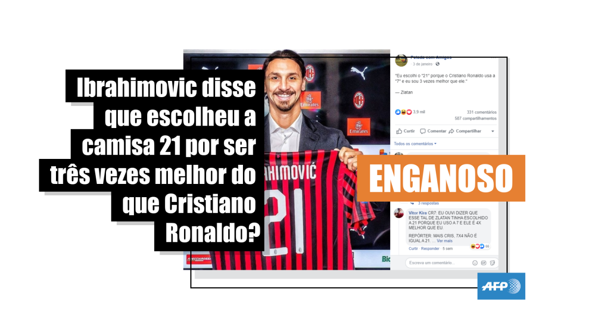 “Eu escolhi o ‘21’ porque o Cristiano Ronaldo usa a ‘7’ e eu sou 3 vezes melhor que ele”, dizem as postagens, acompanhadas por fotografias do astro sueco segurando a sua nova camisa do Milan, compartilhadas mais de mil vezes desde o início de janeiro no Facebook (1) e com mais de 17 mil curtidas e 2 mil retuítes no Twitter (1).