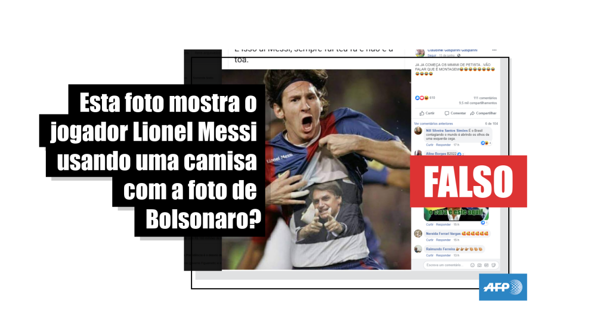 A equipe de checagem da AFP no Brasil encontrou a fotografia original de Lionel Messi, na qual ele aparece celebrando um gol levantando a camisa do Barcelona para mostrar uma blusa branca com a frase “Fuerza tio”, e não com a foto de Jair Bolsonaro.