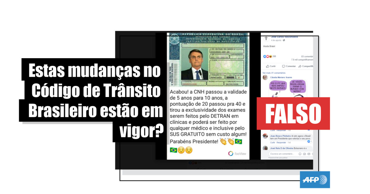 “Acabou! a CNH passou a validade de 5 anos para 10 anos, a pontuação de 20 passou para 40 e tirou a exclusividade dos exames serem feitos pelo DETRAN em clínicas e poderá ser feito por qualquer médico e inclusive pelo SUS GRATUITO sem custo algum! Parabéns Presidente! [sic]”, diz uma das publicações, compartilhada aproximadamente 8 mil vezes no Facebook.