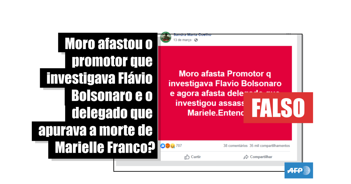 “Moro afasta promotor q[ue] investigava Flávio Bolsonaro e agora afasta delegado que investigou assassinos de Mariele [sic]. Entendeu?”, diz o texto, publicado no Facebook no último dia 13 de março. Outras postagens com a mesma alegação (1, 2) têm circulado em redes sociais neste mês de junho.