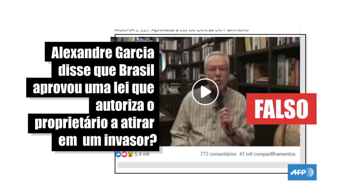 “Por 201 votos a 38 está aprovada uma lei que permite que o dono da casa, o dono da propriedade rural, o dono da empresa, defenda a sua casa, a sua propriedade, a sua empresa, ‘passando o chumbo’ no invasor mal-intencionado. E não importa o número de tiros que você der, nem a consequência. Essa lei vai interpretar isso como legítima defesa”, diz o jornalista no vídeo viralizado.