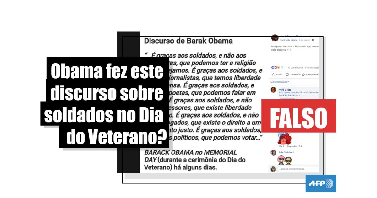 A publicação compartilhada nas redes sociais mais de 3 mil vezes desde que foi postada, em 8 de março, atribui a Obama um discurso no qual ele supostamente exalta os militares como os responsáveis pela existência de uma série de liberdades individuais, e traz como legenda: “Imaginem se fosse o Bolsonaro que tivesse feito este discurso?!”.