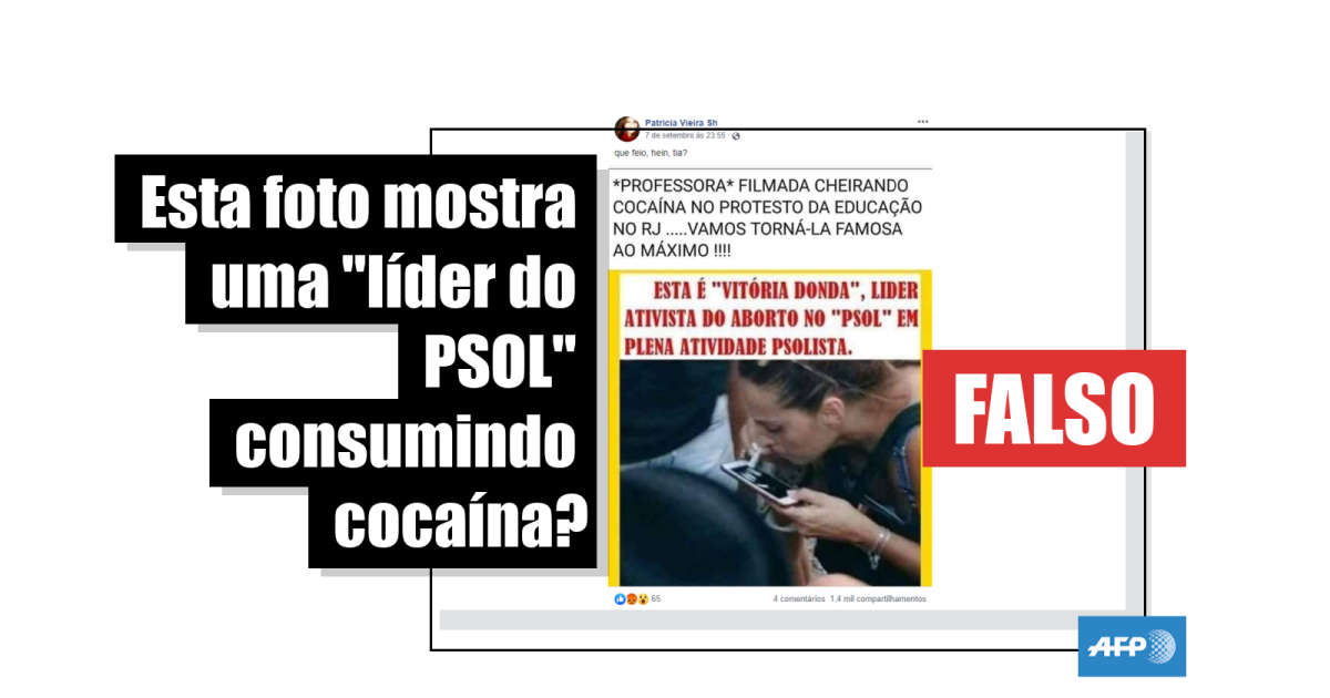 “Esta é ‘Vitória Donda’, líder ativista do aborto no ‘PSOL’ em plena atividade psolista (sic)”, diz o texto que acompanha a imagem em diversas publicações no Facebook (1, 2, 3).