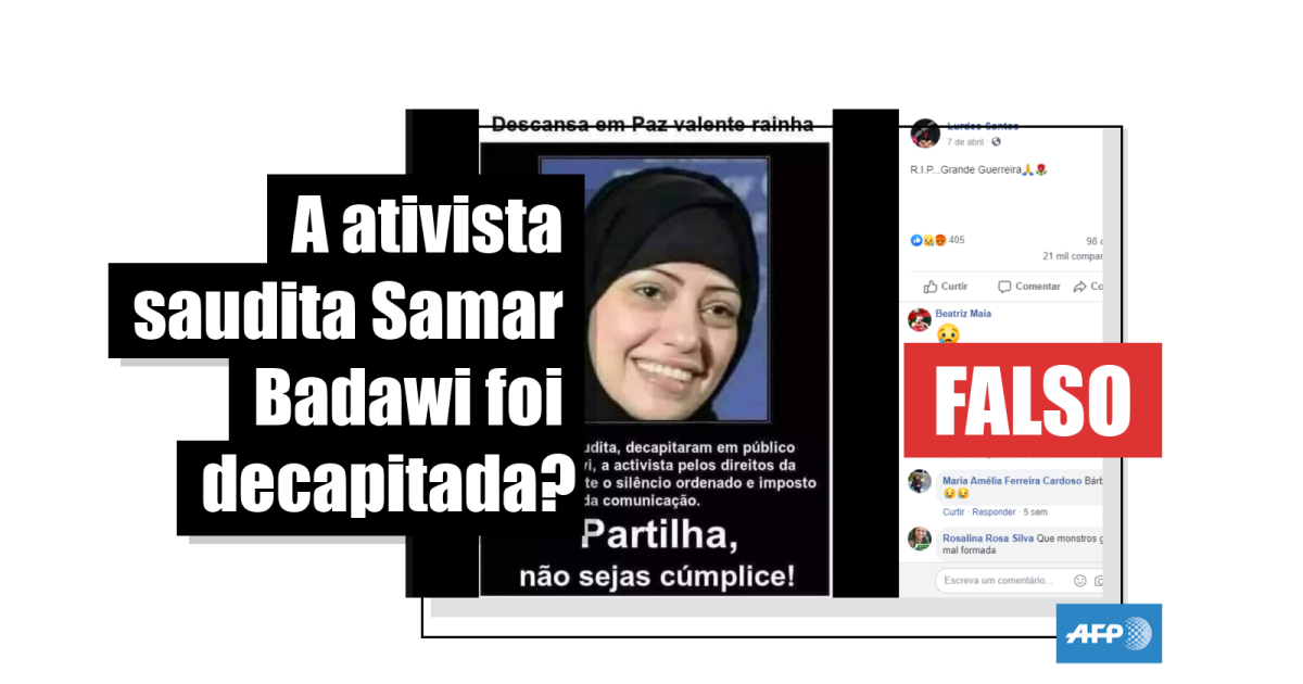 Postagens (1 e 2) compartilhadas no Facebook mais de 21 mil vezes mostram uma foto de Samar Badawi acompanhada de um texto que diz: “Na Arábia Saudita, decapitaram em público Samar Badawi, a activista [sic] pelos direitos da mulher perante o silêncio ordenado e imposto pelos lóbies [sic] da comunicação”. Além disso, pede que os usuários compartilhem esta suposta notícia. “R.I.P...Grande Guerreira”, lê-se na descrição de uma das publicações.