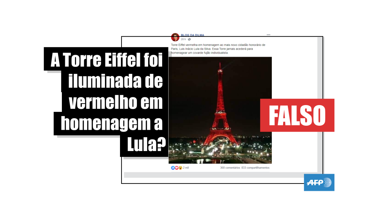 Procurada pela equipe de checagem da AFP na França, uma porta-voz da organização responsável pela administração da Torre Eiffel classificou como “completamente falsa” a afirmação de que o monumento foi iluminado para celebrar a cidadania honorária concedida a Lula.