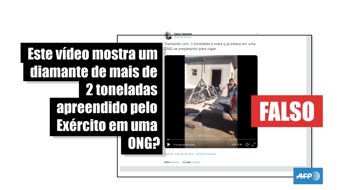 “Diamante com 2 toneladas e meia que já estava em uma ONG se preparando para viajar. Exército invadiu apreendeu esse tesouro agora”, diz uma das postagens, compartilhada quase 6 mil vezes no Facebook. Outras publicações afirmam que a pedra é uma esmeralda ou garantem que o mineral foi encontrado na Amazônia e estaria sendo levado para fora do Brasil.