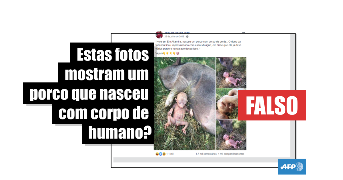 “Hoje em Altamira [município do estado do Pará], nasceu um porco com corpo de gente.. O dono da fazenda ficou impressionado com essa situação, ele disse que ela já deve vários porco e nunca aconteceu isso [sic]”, diz a legenda de uma das publicações, compartilhada mais de 4 mil vezes no Facebook desde 26 de julho de 2018.