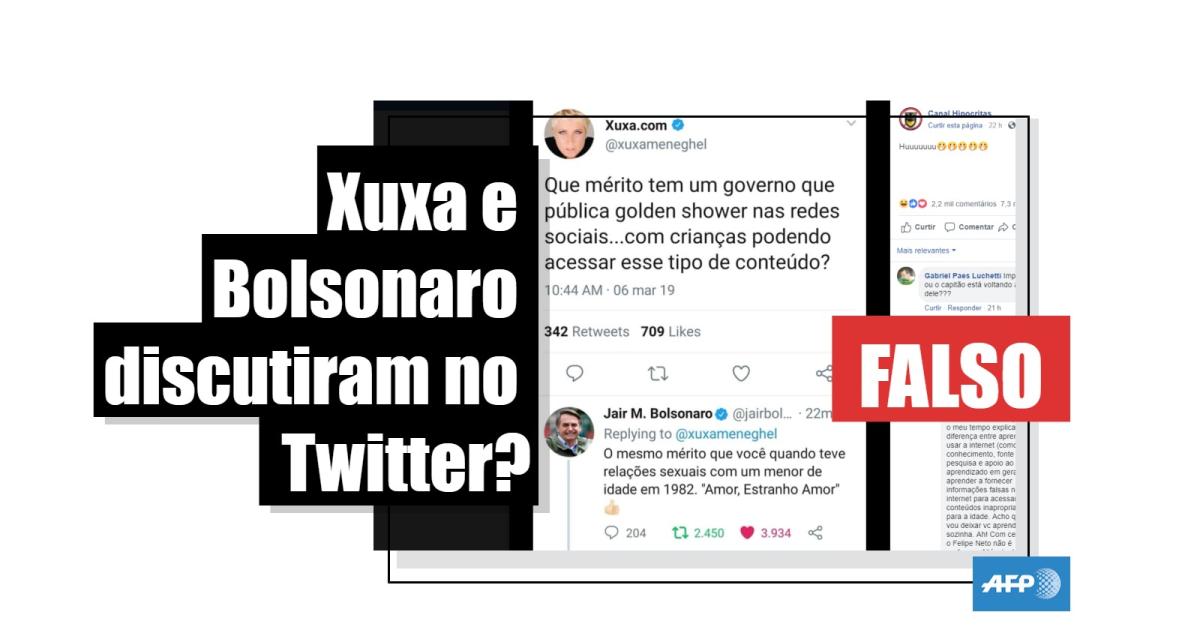A postagem viralizada desde que foi postada, em 6 de março de 2019, mostra uma captura de tela do Twitter de uma suposta discussão entre a apresentadora Xuxa Meneghel e o presidente Jair Bolsonaro. Mas, na verdade, a imagem não aparece nos perfis de nenhum dos dois e já foi desmentida pela “rainha dos baixinhos”.