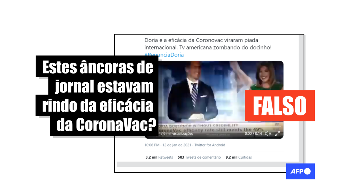 A gravação de 14 segundos, que circulou em larga escala no Instagram (1, 2, 3) e no Twitter (1, 2, 3), mostra dois jornalistas rindo e mais abaixo, na tela, a seguinte informação sobreposta: “Doria governor without credibility” e “CoronaVac efficacy rate still meets the 49%” (“Governador Doria sem credibilidade” e “Taxa de eficácia da CoronaVac atinge 49%”, em tradução do inglês).