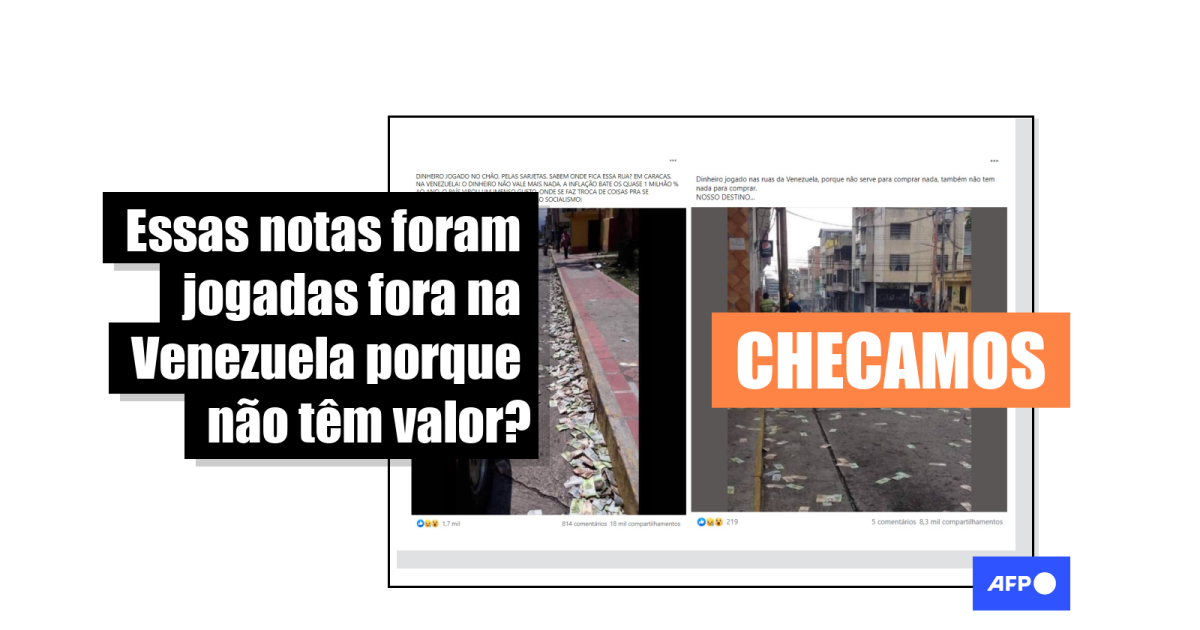 Alegação semelhante circula com uma segunda foto de notas espalhadas pelo chão. “Dinheiro jogado nas ruas da Venezuela, porque não serve para comprar nada, também não tem nada para comprar. NOSSO DESTINO…”, dizem as postagens no Facebook (1, 2, 3), Twitter (1, 2, 3) e Instagram.