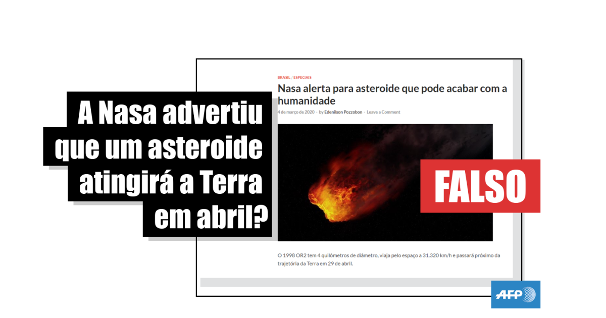 “Nasa alerta para asteroide que pode acabar com a humanidade” e “NASA alerta para um asteroide que pode atingir a Terra em abril e acabar com a humanidade”, são os títulos de alguns artigos e publicações em sites (1, 2, 3), Facebook (1, 2, 3), Twitter (1, 2) e Instagram.