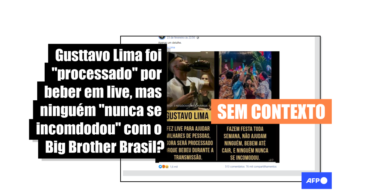 “Gustavo Lima: fez live para ajudar milhares de pessoas, agora será processado porque bebeu durante a transmissão. Big Brother: fazem festa toda semana, não ajudam ninguém, bebem até cair, e ninguém nunca se incomodou”, diz o texto visto nas postagens compartilhadas dezenas de milhares de vezes no Facebook (1, 2, 3) e no Instagram (1, 2, 3) em alguns dias.