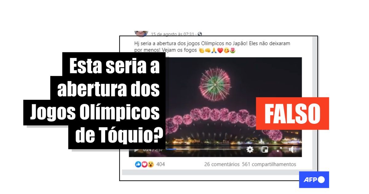 “Fogos preparados por Tokyo para abertura dos jogos olímpicos. Os jogos não puderam acontecer por conta da pandemia mas os fogos não podiam ser guardados até 2021, assim foram apresentados agora. Aprecie os fogos dos jogos olímpicos na base do maravilhoso monte Fuji”, diz uma das publicações, compartilhadas mais de 1.800 vezes no Facebook (1, 2, 3) desde 15 de agosto.