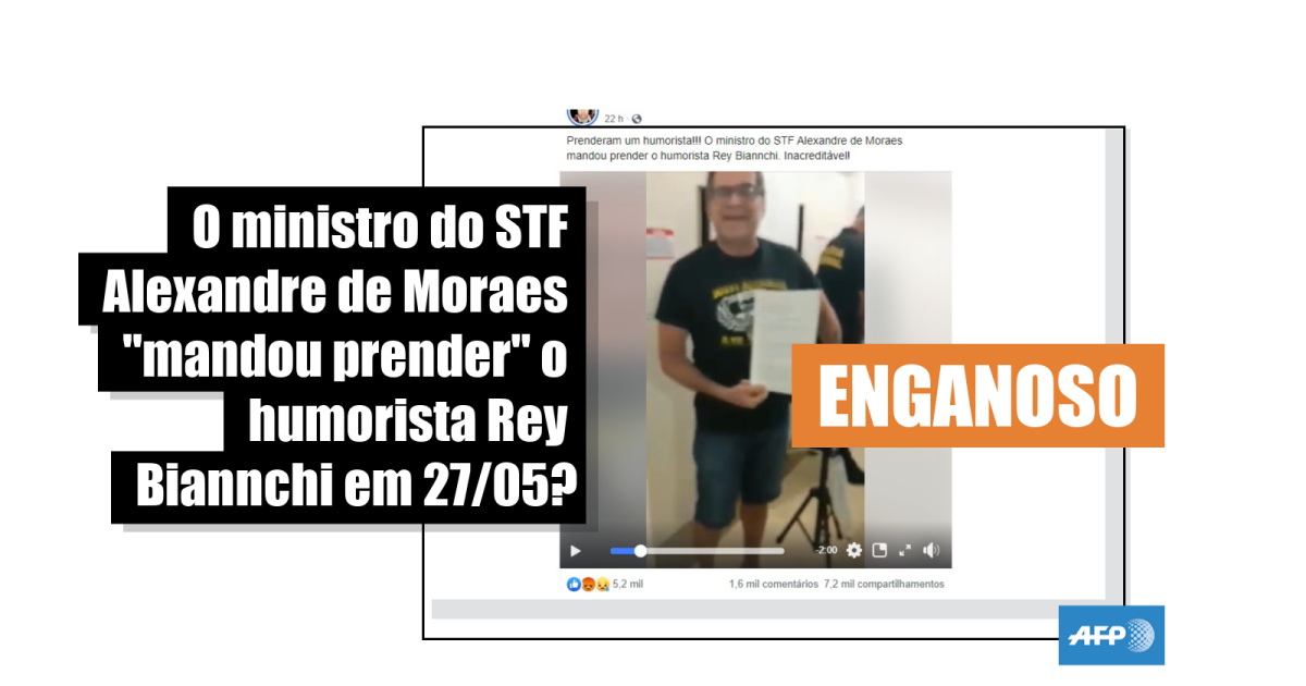 “Prenderam um humorista!!! O ministro do STF Alexandre de Moraes mandou prender o humorista Rey Biannchi. Inacreditável!”, dizem publicações (1, 2, 3) compartilhadas mais de 7.200 vezes no Facebook, desde o último dia 27 de maio.