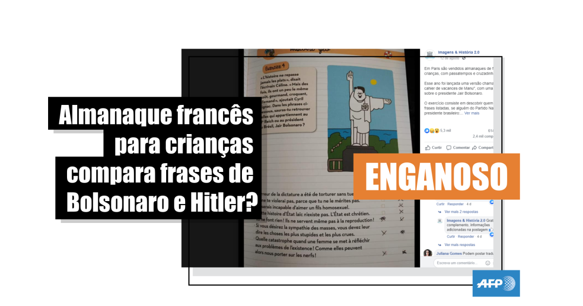 “Em Paris são vendidos almanaques de férias para crianças, com passatempos e cruzadinhas. Esse ano foi lançada uma versão chamada ‘Le cahier de vacances de Manu’, com uma atividade sobre o presidente Jair Bolsonaro”, diz uma das publicações, compartilhada mais de 2.400 vezes no Facebook.