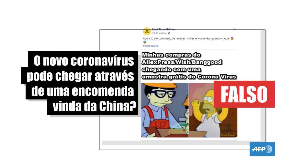 “Minhas compras do AliexPress/Wish/Bangood/ [sites de e-commerce que vendem principalmente produtos fabricados na China] chegando com uma amostra grátis do Corona Virus [sic]”, diz outra postagem compartilhada no Facebook, junto com o trecho de um episódio da série Os Simpsons, no qual um funcionário de uma fábrica asiática espirra sobre um pacote, que é enviado à família protagonista, transmitindo uma doença a Homer Simpson.