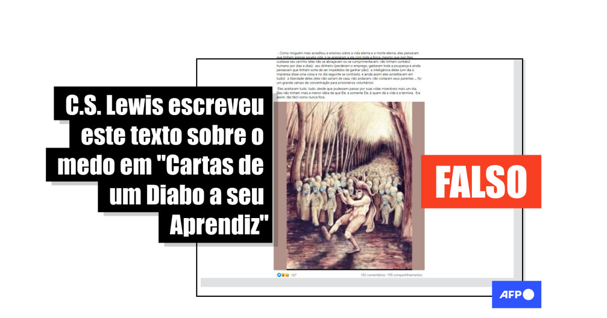 Segundo as postagens, que voltaram a circular em fevereiro de 2021, o texto é uma passagem “do livro ‘Cartas do Diabo a Aprendiz’, de C. S. Lewis, o autor das Crônicas de Nárnia”. “O livro foi publicado em 1942”, acrescentam.