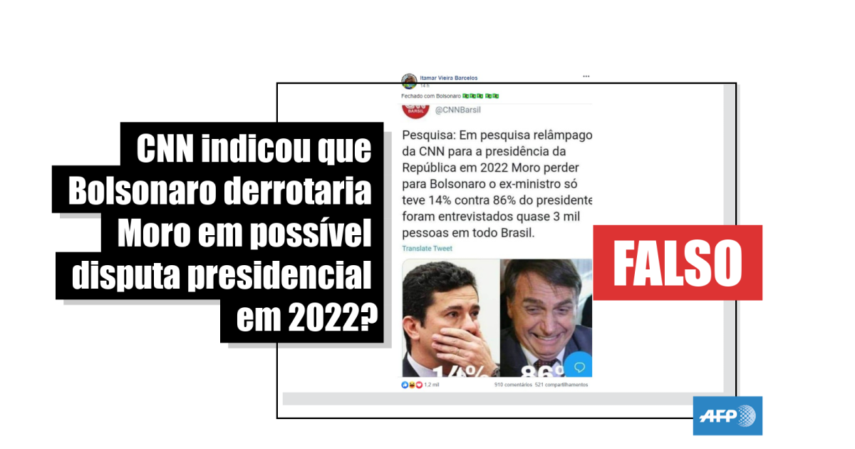 “Pesquisa: Em pesquisa relâmpago da CNN para a presidência da República em 2022 Moro perder para Bolsonaro o ex-ministro só teve 14% contra 86% do presidente foram entrevistados quase 3 mil pessoas em todo Brasil [sic]”, diz o texto da mensagem, que aparece em diversas outras postagens compartilhadas centenas de vezes no Facebook (1, 2, 3, 4).
