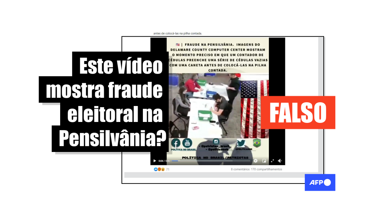 “Fraude na Pensilvânia. Imagens do Delaware County Computer Center mostram o momento preciso em que um contador de cédulas preenche uma série de cédulas vazias com uma caneta antes de colocá-las na pilha contada”, diz uma publicação no Facebook, ilustrada por um vídeo em que um homem revisa e preenche papéis, enquanto é observado por uma mulher.