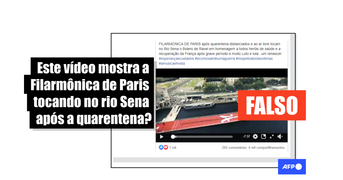 “FILARMONICA DE PARIS após quarentena distanciados e ao ar livre tocam no Rio Sena o Bolero de Ravel em homenagem a todos heróis de saúde e a recuperação da França após grave período e muito Luto e luta ..um renascer. #esperançaecuidados #ecomosairdeumaguerra #respeitoatodasvitimas #amusicaehvida [sic]”, indica a legenda de uma das publicações, visualizada mais de 126 mil vezes, e compartilhada no Facebook (1, 2, 3).