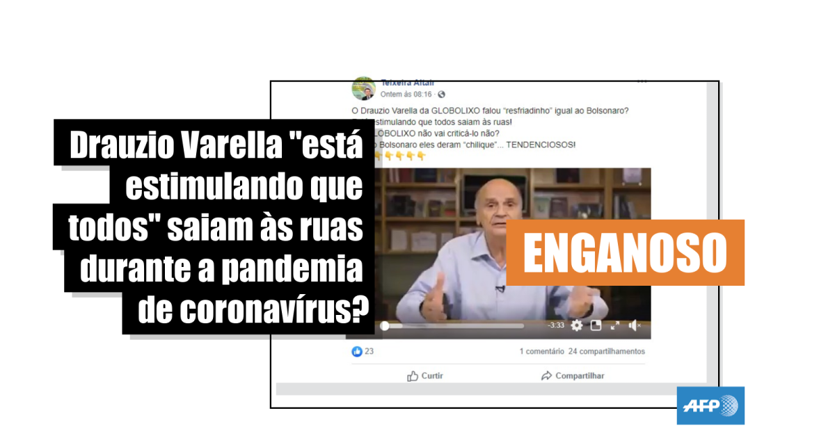 A legenda acompanha um vídeo em que Drauzio Varella diz que continuará andando nas ruas apesar do novo coronavírus: “Claro, claro que vou. Não acho que se justifique qualquer mudança nos hábitos. (...) De cada 100 pessoas que pegam o vírus, 80, 90 pessoas têm um resfriadinho de nada”.