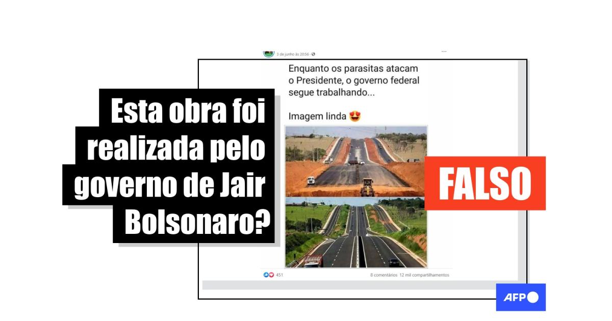 As imagens, que mostram o mesmo trecho de uma rodovia - primeiro em obra e, depois, já finalizada -, circulam amplamente no Facebook (1, 2, 3), Instagram e Twitter. “Maravilha! Parabéns Presidente Bolsonaro e Ministro Tarcísio”, comentou um usuário em uma das postagens, mencionando o ministro da Infraestrutura, Tarcísio Gomes de Freitas.