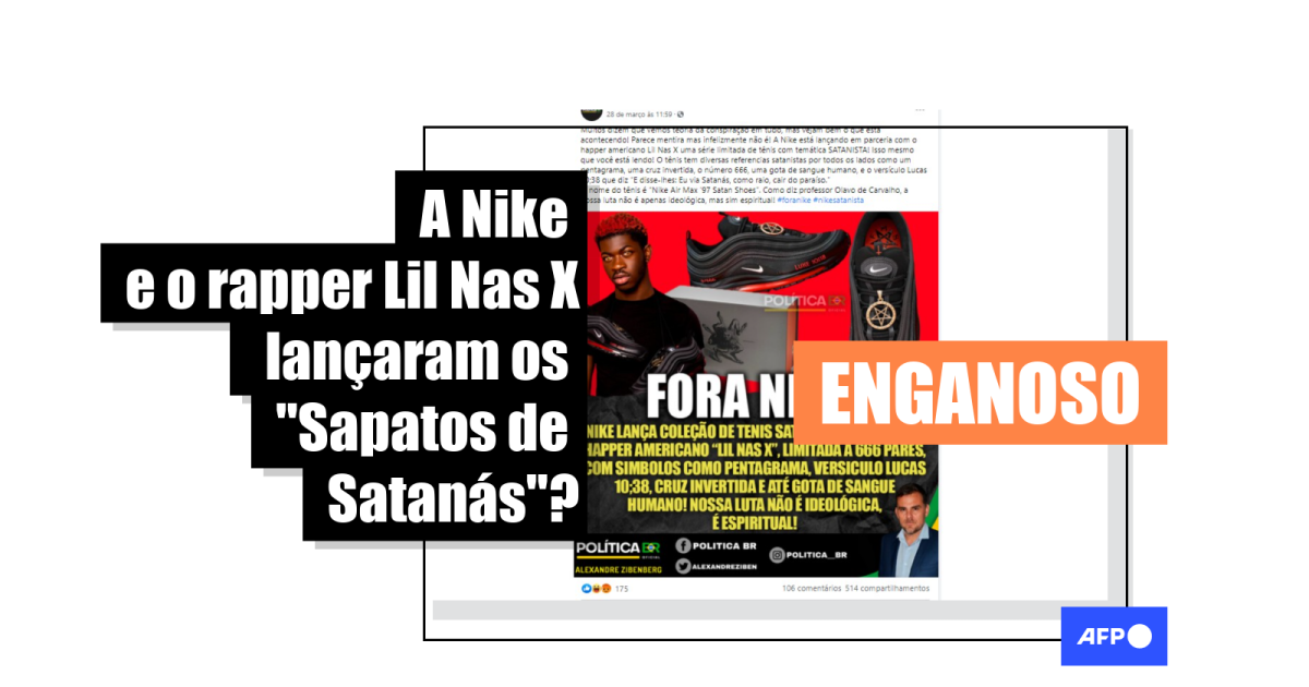 “Muitos dizem que vemos teoria da conspiração em tudo, mas vejam bem o que está acontecendo! Parece mentira mas infelizmente não é! A Nike está lançando em parceria com o happer americano Lil Nas X uma série limitada de tênis com temática SATANISTA!”, diz o trecho de uma das publicações compartilhadas no Facebook (1, 2, 3), no Instagram (1, 2), no Twitter e YouTube.