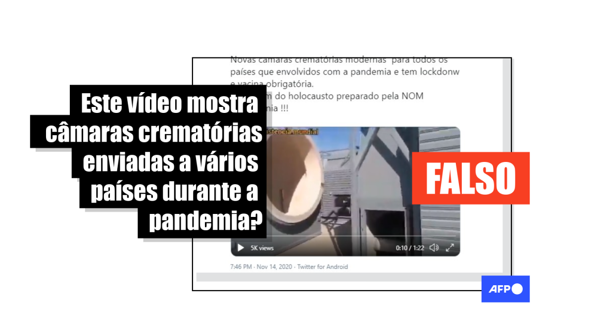 A gravação, de quase um minuto e meio, foi compartilhada centenas de vezes no Facebook (1, 2, 3) e Twitter (1, 2, 3) ao menos desde o último dia 13 de novembro. Nela, uma voz em espanhol assegura que as grandes estruturas exibidas são “câmaras crematórias” enviadas “a todos os países que têm, obedientemente, pandemia, quarentena e vacinação obrigatória”.